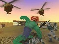 And while watching The Hulk perform all sorts of devastating attacks is plenty of fun, the entertainment gets kicked up another notch thanks to the way the environment reacts to your every move. Pillars will gradually crumble away as the battle ensues around them, the ground will crack and fissure as you jump upon it – basically everything in your immediate surroundings will realistically deform and eventually explode in the wake of The Hulk’s tangents of fury. And if the environments suffer this much destruction at your hands you can imagine how the host of enemies will feel. Throngs of opponents will constantly bum-rush you and shoot at you with their measly automatic weapons and missile launchers, but power in numbers is a concept that is lost on The Hulk and the feeling you get from ripping a giant pillar out of its foundation and killing multiple enemies with each swing is extremely satisfying. Aside from your run-of-the-mill human opponents, you’ll also get to put the smash down on mechanized Hulk-like robots, giant gamma dogs, helicopters, gamma-enhanced soldiers, and a host of boss characters. Each enemy has their own life bar which diminishes as you kick their ass, giving the game a sort of 3D Final Fight feel.