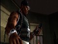 These monies can be traded in at the ‘Hood, a neutral area that you can return to between stages, where you can buy armor, weapons, and ammo. With enough cash, you can outfit 50 with a full wardrobe of Marc Ecko gear, from tank tops to hoodies; as a matter of fact, Bulletproof features a number of exclusive items from Ecko’s forthcoming fall and holiday lines. You can also purchase expensive but impressive cheat codes for small fortunes by speaking to Iceberm, Eminem’s lawyer; pick up 50 Cent tracks and UMD-quality music videos from DJ Whookid; and train up your skills by purchasing new counterkills from Popcorn, the unhinged resident of an abandoned theater.