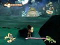 However, despite the easy controls, fighting is more of a chore than a challenge due to the shoddy hit detection. Lucas can attack quickly, but the range of his staff rarely seems to match which enemies get hit. Often a spider right in Lucas' face will suffer no damage, while a pill bug well outside the range of his weapon is defeated. This strange invincibility works in both directions; an enemy's attack will pass right through Lucas almost as often as it hits him. It can be very frustrating to take damage from an attack simply because Lucas' staff missed every single enemy in range, and when trapped between two powerful enemies, it can quickly lead to Lucas' untimely demise. Fighting multiple foes is a real chore, as the controls do not allow for quick switching between targets. Even fighting from a distance doesn't ease things because at long range, the lock-on feature is especially inaccurate. It's far too easy to miss shots from the ranged weaponry despite a perfect lock, which is made more annoying by the issues with hit detection.