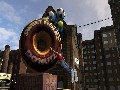 However, PAINdemonium is really just a practice mode to prepare players for the humorous tasks found in Challenge mode, which is where Comedy takes center stage. Two challenges were on display at Gamers Day: Mime Toss and Spank the Monkey. In Mime Toss, a pale-faced mute suspended in midair must be grabbed and tossed at a scattered assortment of nearby windows. Spank the Monkey, on the other hand, drops a pair of primates at various spots in the cityscape and challenges the player to dispatch with both in a single shot (though they can be taken down separately). Goofy sound effects and animations fill every aspect of the game to maintain its light-hearted nature.