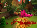 Gory animations are the most notable thing in Fairytale Fights. Despite the cute character designs, the game is a completely blood-soaked murder fest. Every attack you do will deal terrible damage to your foes by popping off limbs and causing blood to spurt everywhere. Depending on how you kill enemies, you may even get gruesome close-ups of the foes as they split in half, get torn to shreds, or have their bones broken. Every fight leaves the area around you soaked in blood, which you can then slide around on like it's ice. In short, it's not a game for the younger crowd, regardless of how bright and cheerful everything may appear. Fairytale Fights has an interesting cartoonish art style, which combines with the gore to create a rather bizarre and surreal feel. The fairy tale characters don't talk at all but communicate in grunts and screams. They're actually very reminiscent of the Raving Rabbids from the Rayman games, only significantly more violent.