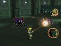 Aside from the platforming elements, the addition of flight is a new gameplay element that sort of replaces the racing segments from Jak II onward. When the game begins, Jak starts off controlling a pretty basic aircraft, and you're quickly introduced to the basics of dogfighting and taking down larger aircraft, usually by targeting various areas until you've whittled it away to nothing (or to the necessary story point). This new element actually handles quite well on the PSP, and the controls are basic and thankfully easy to pick up. You simply control movement with the analog nub, barrel-roll with the d-pad, accelerate to top speed with the left shoulder button, and shoot at targets with the right shoulder button. Some of the flight combat stuff tends to go on a little longer than I'd like, and while the action is broken up by the occasional mini-game that has Daxter launching himself at an opposing ship to take it down piece by piece, it's not quite enough to alleviate some of the boredom you'll feel. There are often way too many basic enemy ships to take down, and they're pretty much mindless drones. When you run into the bigger air ships or bases, you're simply taking down a series of guns and parts over and over again, a process that usually requires you to circle back for multiple passes. If you're down for the repetitive task, it controls really well, but I'd like to see this feature spiced up a bit if it's used in a future game down the line.