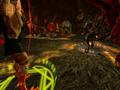 The controls for Chaotic: Shadow Warriors stand out in a good way. For the platforming sections, you'll use the left analog stick for movement and the right analog stick for camera control. The A button makes Tom jump, the X button initiates scans of specific objects, the left trigger points you to where you need to go, and the right trigger fires the Pyroblaster. During creature combat, the A button confirms a menu choice while the B button cancels it. The face buttons are used during attacks to gain bonuses, and the right analog stick plays mugic notes. The left trigger in conjunction with the left analog stick performs creature scans, and the right trigger in conjunction with the A button performs blocks. This sounds complicated on paper, but in practice, it couldn't be easier, especially since the combat controls are displayed on-screen all the time. The controls are responsive, both during the platforming and combat portions, and scanning is quite easy because the game remembers your last cursor position if you didn't complete a scan. All in all, players won't have anything to complain about as far as controls are concerned.