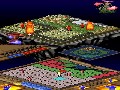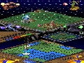 Graphically, Populous DS invokes the spirit and style of its SNES predecessor. The touch-screen portion functions primarily as a tool that allows the player to navigate and edit the world with as little clutter as possible. Worshipers are represented as blue pegs, and cities are simple blue tiles. Stones, which impede building, are white tiles, and any lingering negative miracle is represented by a specific symbol. The top screen is meant to show a more attractive vision of the world. Tiny faceless sprites wander randomly in a well-drawn, if minimalistic, 256-color landscape before settling down to build familiar 16-bit villages.