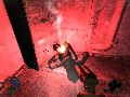 The game alternates pretty regularly between combat and solving puzzles in mental echoes, and the appearance of heat sources usually indicates that the switch is about to occur. In combat, your only source of health is accumulated heat, displayed as a red-blue gauge at the bottom of the screen. If you get hit or sit still in a cold area, you start to lose heat; if you run out of red, you drop dead. This gauge doesn't appear in mental echoes, where one hit or wrong step usually means you're dead, but mental echo deaths only send you back to try again, as opposed to real-world deaths, which make you load your last save. You recharge after fights or whenever you can by holding out your hands to powered lights, electric heaters, electrical transformers or the sparking remains of makeshift fires.