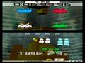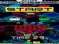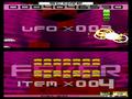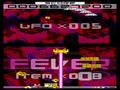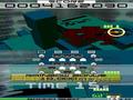 First of all, enemy waves are more complex. While you're battling the same types of aliens, they don't come in rectangular waves, and they vary in color and special effects. Some have glowing eyes and disappear into the background, others twist to be a single pixel thick, and others explode when hit to destroy surrounding units. Of these traits, color can be the most important; shooting four in a row of the same color gets you a power-up (white units don't count and can be shot without penalty), and getting two power-ups in a row sends a glowing UFO across the top of the screen. Shooting it reveals the game's biggest twist, as the top screen stops showing statistics and is replaced with a special formation. If you can destroy that formation within a given time limit, then the game goes into Fever Time, where all units become gold and drop point bonuses, which can be blasted through rapidly enough to often clear two or three waves of enemies in seconds.