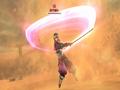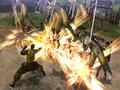 Graphically, Sengoku Basara: Samurai Heroes fluctuates between doing some things better and some things worse than the competition. The character models look much more detailed, with some characters sporting actual stitching on their clothes. There are also better animations, especially with enemies, who try to crawl away when they're close to death instead of just fleeing. The environments look fine, and there's no sense of fog of war effects hiding the horizon. Particle effects, such as the trails left from special attacks and muzzle flash from gunfire, look good as well.