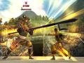 The game's audio is well done and stays true to its slightly silly nature. As expected, the music consists of hard rock with guitar riffs, but it also branches into other genres. You'll hear sweeping orchestral scores in the menus and world map and, depending on which warlord you're fighting against, you'll hear the score change to Latin guitar, piano jazz, or something from a Looney Tunes cartoon short. Luckily, the score isn't overpowering, so you're never overwhelmed by it. The voices are rather well done, and the cast almost mirrors that of the voice cast used for the upcoming anime dub. What's interesting is the conversational banter that occurs during the boss fights. It feels odd to hear a warrior talk about his love for the forest or how both fighters agree to an alliance while still trying to tear each other to pieces, but it's strangely fitting when you think of the other odd things going on. The delivery of some lines falters every now and again with the foot soldiers, but it generally sounds good despite some of the cheesy lines. The effects emphasize punches and sword swipes while playing down others, such as your hero's footsteps.