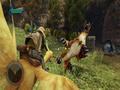 A good portion of your time in The Crystal Bearers is going to be spent playing various minigames. Some of these games are optional, while others are part of the plot. Sometimes you'll be shooting down monsters with a Wiimote-guided cannon, racing Chocobos, throwing wine barrels at foes, fishing, playing a ridiculous game of soccer, or countless other things. Most of the minigames are reasonably fun. Some are a bit dull and a few others could have had better controls, but they're perfectly serviceable. One of my favorites has a pseudo-stealth sequence where you have to escape from guards by performing a variety of actions, some of which have different consequences later on. Perhaps the thing that will most turn people off these minigames is that you can't really lose. At worst, you'll either restart from a nearby checkpoint or get a bad score at the end of the sequence. The Crystal Bearers appears to be doing everything it can to facilitate you doing neat things, instead of working against you. This is a double-edged sword, as it makes it very easy for casual players or young gamers to have fun in The Crystal Bearers. On the other hand, the traditional Final Fantasy audience will probably feel unsatisfied with how little the game asks of them.