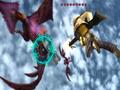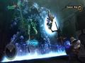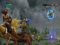 Despite showing some rather adept kung-fu skills in cut scenes, Layle doesn't actually do hand-to-hand combat and uses his gravity powers to fight enemies instead. You can grab an object with your powers by holding the cursor over it for a few seconds while holding the B button. Once an object has been grabbed, you can toss it in various directions or capture it and hold it over your head. However, defeating enemies isn't as easy as throwing them around randomly. Every object in the environment reacts in different ways to other objects. For example, picking up a bone might cause all the dog-like monsters around you to become friendly and follow you around. Other enemies may react in unique ways if they're picked up by Layle's gravity powers. A bomb can explode, doing massive damage to everything around it, or a water-spewing enemy can be used as a makeshift squirt gun. Regardless, each object in the environment has some kind of use in combat, including enemies.