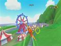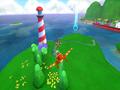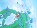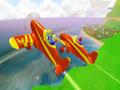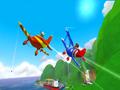 On the positive side, the controls are incredibly simple to pick up and play. Sky Captain only requires you to use the Wii Remote, and you hold it sideways much like a traditional NES controller for Virtual Console titles. This allows you to pitch the control forward and backward to control the dive and climb of the plane, and it also allows you to tilt left or right to control your turns. You can hold down the 2 button to gain speed, the 1 button to brake, and shoot out water balloons with the A button. You can even switch between the third- or first-person perspective by pressing the up button on the d-pad, providing an interesting change of view while flying around the islands.