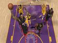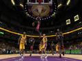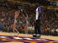 The manner in which Greatest mode games are commentated is a bit odd until you get accustomed to it. The two commentators not only provide play-by-play for the game, but also detail the whole careers of legendary players. They'll be talking about the Jazz's Stockton's charge for the basket, actually underway at that moment in the game. Next, they'll wax nostalgic about Kobe Bryant as a young Laker opposing Utah. A few seconds later, back to Stockton, talking about his age at retirement, and wondering aloud if maybe he had a few more NBA seasons in him. All this occurs in the space of a couple of minutes. It's like a mash-up of historical highlight film and live-action game, but the way it's scripted, the commentary provides a fluidly integrated opportunity to learn something about the entire careers of big NBA stars, some of whom are still playing today.