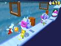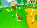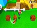 The trend of excellent graphics continues with this entry. Like always, Mario's world is filled with bright colors to the point where even darkened houses retain a cheery, cartoon look. That world is packed to the brim with details, thanks to some clean texture work and little details like footprints in the sand. Enemies share that same colorful tone and attention to detail. With few exceptions, you can read the facial expressions of each quite well, so it's a treat to see the Boos blush when you look at them or the giant moles act shocked when you squash them down the first time. Like always, Mario is well animated, and seeing him move fills you with the same awe as it did in Super Mario 64. There are a good number of particle effects, and they're all done well. Smoke puffs from starting up runs, falling leaves, brushed off snow, and embers from nearby lava all add life to the atmosphere and make this one gorgeous-looking portable adventure.