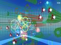 The game mechanics are very different than what you're used to seeing. Instead of controlling a ship, you control a reticle that can take on any shape at any given stage. Unlike other shooting games, enemies are invisible in Dream Trigger 3D, and even if you see a hint of where they are, shooting at it does nothing. You need to uncover the enemy locations using sonic pings. Laying down the ping simply sets them up while a bar, timed to the beats of the level's song, sweeps over to detonate them. If an enemy is in the vicinity of the sonic ping's blast radius, the enemy is then revealed and can be shot. Shooting also gives you temporary invincibility, which proves to be useful when the screen is filled with bullets. To prevent rampant pinging and blasting, however, the sonic pings and laser blasts have limits, and while the pings regenerate over time, the laser energy is only refilled when one of the pings successfully uncovers an enemy.