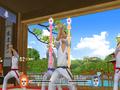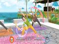 Graphically, the game is below the quality set by the company for its Wii games. Character models for the exercise routines look decent though not as detailed as you would expect. Everyone wears one or two types of plain-colored clothing with nothing else adorning it. Their general animations look fine, but don't expect much mouth movement when they speak. The environments, though, look great even though some of them feel like they're just touched-up versions of what was seen in We Cheer. The minigames go for more of a cartoon look than a realistic one, though they don't look very proportional; the upper half of the bodies look more bulky than muscular. One big thing plaguing the game's look is the lack of anti-aliasing throughout every mode. Things don't look so bad when viewed up close, but once the camera pulls back for a wide view, everything becomes a jagged mess, making it hard to see faces, let alone little things like the drawstring ties on some pants.