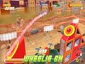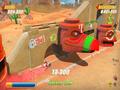 Graphically, the game looks just as good as it did on the PS3. The cartoon look, complete with bright colors, makes it stand out. While Joe and the members of Team Nasty look great, it's the background that stands out as being the most memorable element. The mountains and random blocks really add to the lighthearted look, but the random ads that litter the track are what one will remember the most. Cute monkeys serving as the mascot for a repair shop and a gentlemanly looking T-Rex hawking tea are rather humorous and become a very memorable part of the game's appearance. The animation is also well done for little things, like dancing cacti, and bigger things, like Joe crashing into a shark tank. However, the inability to skip longer crash animations gets annoying after time. Overall, this is a great-looking game that has the benefit of running at a smooth 60 fps.