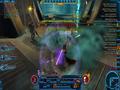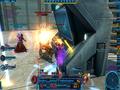 Characters of any level can participate in some warfront action, the game's answer to PvP battlegrounds. To join, you simply queue up, and after a short wait, you'll find yourself able to join a random choice of one of the three available warfronts. Civil War plays out with both sides trying to control the majority of the three anti-air batteries, so they try to shoot down the other team's ship first. Voidstar has one side defending a series of door pairs on the titular starship while the other side tries to blow them up to advance deeper into the ship. Finally, Huttball plays like a modern version of Deathrow in which each side fights over possession of a Huttball. Once a player has the ball, he can run it into the end zone and try to pass it to another player to keep the ball moving. Of course, if the various environmental hazards found in the maze of platforms and walkways doesn't kill you, the other team certainly will.