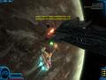 Every story involves the class getting a ship of its own at the end of the second planet, which serves many purposes. It's essentially your player house, albeit a non-customizable one in which your crew hangs out, as well as your method of traveling between planets. However, the ship has gear of its own and can be taken into the ship missions, which play out a lot like Starfox. You fly down a predetermined flight path, although you have control over where your ship is on the screen. While in these missions, you use your blasters as well as your limited supply of missiles to shoot enemy fighters, shield generators and turrets; and attack or defend space stations. These missions are pretty simple and start off easily, but at the endgame, they pick up in difficulty and require a fair amount of tactics to complete successfully. Doing so nets you experience as well as credits and fleet commendations, which can be turned into choice ship upgrades, such as a proton torpedo launcher or an EMP disruption device.