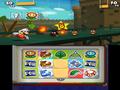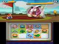 Another twist to the system is that the traditional Paper Mario partners are sadly absent. In their place is a new Battle Spinner system. At any time, you can spend three coins for a chance to play a game of slots. Match two icons, and you'll unlock the ability to use two stickers in the same turn. Match three icons, and you'll hit the jackpot: three stickers in one turn, two stickers in the next turn, and a special bonus determined by the icon you matched. Match three mushrooms, and you'll get a free burst of healing. Match three coins, and you'll get extra cash. This isn't optional, as certain enemies require that you get at least two attacks to effectively damage them. An early boss in the game is only vulnerable to damage when he's knocked on his back, but he'll always spend his turn getting up, so you'll need at least two turns to damage him.