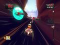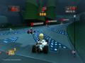 Graphically, the game fits the kart racing model perfectly. The racers animate rather well and have lots of funny animations. Everything, from the pre-race salutes to the toying with helmets and the podium dances, will elicit a chuckle the first time you see them. The tracks are very colorful and feature lots of things to view. From the neon lights in some areas to the appearances of some unlikely landmarks, each track has at least one thing that makes it stand out in a good way. Particle effects and car damage are rendered well, and the car animations when it's being fixed up are always nice to see. The whole things holds steady as far as frame rate is concerned, and it never hints at slowing down, even when playing split-screen.