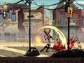 Graphically, Dusty Revenge is quite beautiful. The character sprites, while not exceptionally large, are very detailed. The scars on enemies, grimaces when someone gets hit, and the gritting of teeth when shooting a shotgun are all visible and look great. The animations are also quite smooth, with rarely a hitch during transitions. The backgrounds are also nicely detailed, and the use of a watercolor-style of cel-shading adds to the visual flair. There's a lack of any real particle effects, though. Smoke is rarely used, and even then, it looks simple when compared to the other visuals. Laser barriers simply fade instead of pulsate, making you think it's part of the background instead of something lethal, and downed barriers and platforms simply fall or fade away without any ceremony. When compared to the rest of the game, the lack of spectacular effects makes the title feel a little blander.