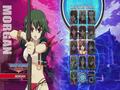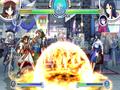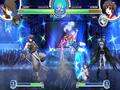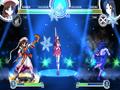 Fans of the Arcana Heart series should know what to expect from Examu when it comes to graphics. The characters look good, with some nice details and animations. The particle effects in some of their moves match the anime aesthetic well, and they don't slow down the game. The backgrounds offer similar traits, as each one looks great thanks to the amount of action happening on-screen. Half of the backgrounds have people milling around, and while their animation cycles are anemic compared to the fighters and partners, it's still more than what's typically seen in 2-D fighters. Whether it's the slightly smaller character size or lack of anti-aliasing, the graphics aren't quite as good as in other 2-D fighting games. The question of graphical fidelity also comes into play at the character select screen, as slowdown occurs the first time you select a fighter and partner.