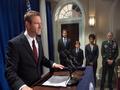 Eighteen months later, President Benjamin Asher (Aaron Eckhart) is meeting with the South Korean Foreign Minister Lee Tae-Woo (Keong Sim) when the invasion begins. It all happens at a breakneck pace — a C-130 flies in restricted airspace and shoots down F-15s, sleeper agents who were posing as tourists start bombing and shooting, and the mounted machine guns come out — and when the army finally rolls in 15 minutes later, you realize that you've been holding your breath. (Homefront, anyone?)