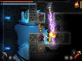 After a brief introductory level where you find the remains of your dearly departed uncle, you're introduced to some basic game mechanics before you're let loose on your newly inherited mine. Here, Steamworld Dig takes on a formula made popular in titles like Terraria and Super Motherload. You're presented with nothing but dirt, and you must use your pickax to dig around the mine to unearth valuable gems and minerals. There's no limit to how far you can dig down, but your bag can only hold so much loot, and your lamp has a finite amount of fuel. Once it goes out, you can't see what dangers lie ahead. Once this happens, you have to return to the surface to receive a free, automatic refill of lamp fuel. You can trade in the minerals you collected for cash, which can then be spent on better pickaxes, bigger loot pouches, or health refills. Travels between the mine and the surface will be frequent, and even though you can move quickly and have a quick wall-jumping ability, the constant traveling can become monotonous. Luckily, the game does several things to alleviate this feeling.