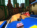 For a budget title, the graphics are pretty good. The environments are well detailed, with nary a blurred texture, and the amount of variety in the track layout is impressive. There's a nice sense of scale to the objects in relation to the cars, so those looking to re-create a Micro Machines vibe will find this to be a big plus. Like the environments, the cars are nicely detailed in both the car selection screen and on the track, even with the limited viewpoint during races, and the frame rate remains steady. The only bothersome aspect in this area is the weapons, which lack a punch when they hit their targets. Having a player hit a bomb looks unimpressive due to the small puff of black smoke that appears once the bomb is detonated, and getting hit with a missile is even less impressive due to the size of the missile and the much smaller accompanying explosion. Then there's the EMP blast, which is so faint that you might not even notice that you've been hit.