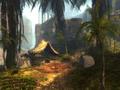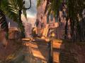 The center of the map is a giant jungle oasis. It’s filled with complex rocky terrain, winding streams, bamboo walkways through the trees, an enormous golden temple, and dinosaurs. This is an environment that caters to roamers, ambushers, and gankers. Once every three hours, an event begins within the oasis. An energy cannon of great power sits atop the golden temple, and naturally that means your team will want to be the first to charge it up and fire it! Players will scatter throughout the oasis, defeating dinosaurs that have swallowed the weapon’s power cores and returning those cores to any of three Durmand Priory research camps located on the outskirts of the oasis. It’s not as easy as it sounds; enemy players will try to attack your team’s carriers and steal the cores for themselves. Once a team has collected enough cores to power the weapon, the cannon will begin firing blasts of energy at the outer gates of all enemy-owned towers and keeps in the map, gradually obliterating them. Even if your team already controls all of these objectives, you’ll still want to control the weapon, if only to prevent the enemy teams from using it against you!