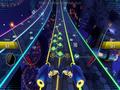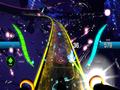 Unlike past games, which showed off music video snippets on moving monitors or virtual rockers dressed in gaudy outfits, the backdrops in Amplitude are relatively distraction-free. You'll see shiny blobs of hexagonal matter pulsate with some of the heavier beats, and the fully activated lanes crumble away in a delicate manner, but it is otherwise a benign affair. The lanes and ships are reminiscent of the designs in Audiosurf due to the bright neon colors that outline everything, but beyond that and the light shafts to guide you to a new section, what you're getting is more functional than flashy. Some tracks appear almost immediately as if to try and catch you unawares, but this occurs so rarely that it isn't that bothersome.