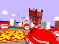 In its current state, the game has three modes. Free Play is probably the best place to start, as you can get a general idea of everything offered. You start by picking a bus, and each one has its own characteristics. Mr. Bus is a good all-around choice, the Barrel Bus is great at being able to stay on its wheels, and the Ultra Bus is two busses connected together that can fishtail much like an out-of-control big rig with an attached trailer. After that, you land in the middle of a decently sized piece of land, where you quickly discover that smashing into buildings gives you points. You also find out that there are speed pads that make you go faster and pinball bumpers and trampolines that send you skyward. Here, flipping and landing also gets you points.