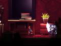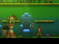 Graphically, the game is fine in some parts. The painted style for the stage backgrounds is nice, and though they aren't animated as robustly as Brand is, the other toys and creatures look good, with some nice details here and there. The frame rate holds up pretty well, and the game isn't afraid of having lots of things moving around on-screen at once. Give it enough time, though, and you'll see those same things betray the game. Some of the foreground elements that give the scene depth are too good at hiding enemies, and the darker lighting combined with the colors make the shurikens from very difficult to see. It can be tough to tell which pieces of furniture you can walk through and which ones will be solid once you jump on them. The text for the game is also tiny, which is odd since the title was also made for the Xbox One, and you expect console games to have text that's legible from further distances.