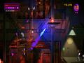 In terms of aesthetics, Damsel wholeheartedly dives into the emo phase of the mid-2000s, with cartoony pink skulls plastered across the screen as your black-clad, purple-haired heroine darts across the screen, as if Hot Topic had burst into the world of interactive advertisements. Embracing the chicness of being retro, Damsel also boasts a more cartoonish art style, mixing the look of Hanna-Barbera classics like the Jetsons with the dark grays, moody reds with vibrant violets of an animated version of psychobilly culture. It could definitely go in a modern Cartoon Network lineup. This art style matches the tone of the game rather well, with the story mode filled to the brim with brooding, quippy one-liners. The UI follows suit, and while it's effective, it's on the small side, leading to things like Damsel's life bar being overlooked even after an entire hour of playing.