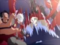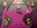 The example casts Naruto, with Sakura in the wings to help out every so often, in a training match against Kakashi, who's now armed with a special variant of his lightning storm-inducing Thousand Birds technique. The attack requires a precisely timed double jump to completely evade, sending rocks flying on the stage floor and periphery to expand the stage a little. As the fight hits certain points, the game takes control to offer scenes that mirror the anime and shift the situation. When Kakashi is nearly downed, this results in a special scene where Naruto knocks two bells off his teacher's belt to win the training match.