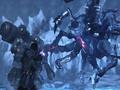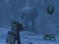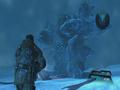 Later, as you descend into a large cave to place some mining equipment, a giant crablike alien breaks through the ice, prompting what is essentially a boss fight. You must dodge its charges — optionally shooting weak points on its arms to blow them off and limit its offensive ability — before finally shooting the ice off its back and the pulpy weak shell underneath. After the fight, you operate the mining equipment and find what looks to be a long-lost outpost deep beneath the ice.